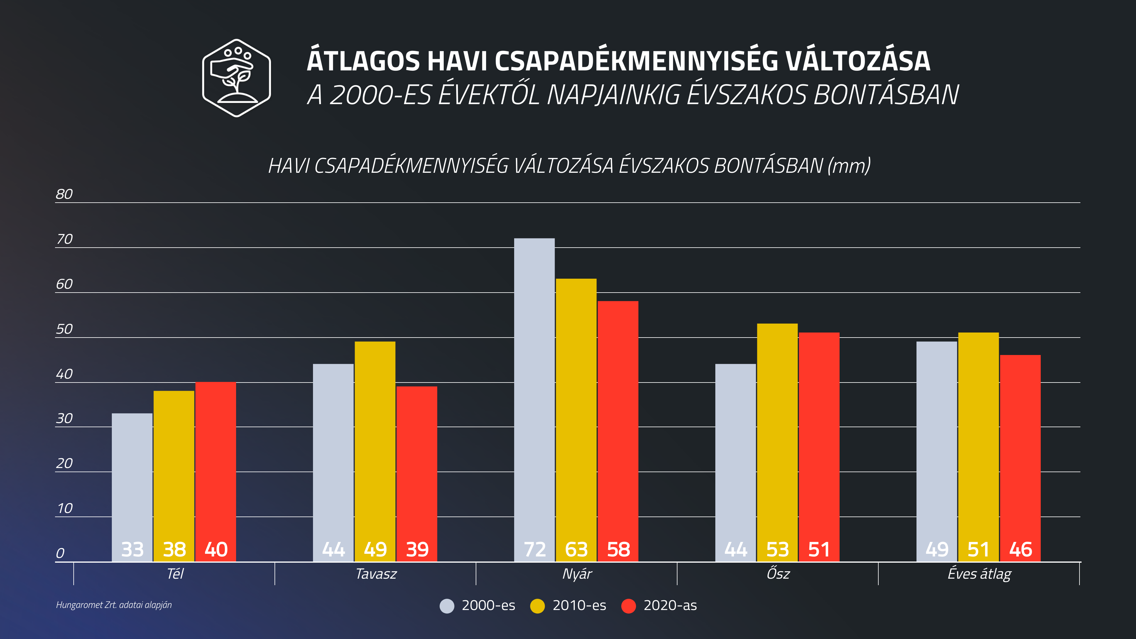 A legjelentősebb változás a csapadék évszakos, illetve vármegyei eloszlásában figyelhető meg. Az őszi és a téli átlagos havi csapadékmennyiség enyhén emelkedett, ugyanakkor nem tudja kompenzálni a tavaszi és nyári csökkenő csapadékmennyiséget, ami viszont a vegetáció, növénykultúrák számára kiemelten fontos lenne.