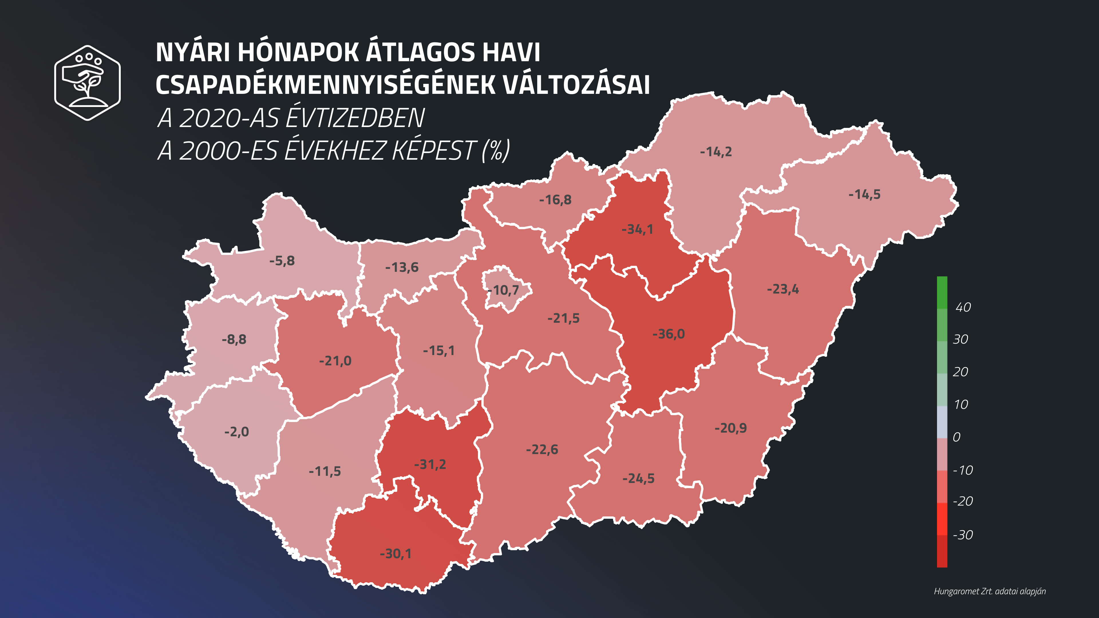 A nyári hónapokban országosan csökkent az átlagos havi csapadékmennyiség a 2020-as évtizedben a 2000-es évekhez képest, ugyanakkor területi egyenlőtlenséget is mutat a változás. A számítások alapján a nyugati vármegyékben a csökkenés 10% alatt maradt, az alföldi vármegyékben pedig jellemzően 20-25%-kal kevesebb csapadék hullott. A legnagyobb csapadékhiánnyal Baranya, Tolna, Jász-Nagykun-Szolnok és Heves vármegye érintett, ahol a nyári csapadék több mint 30%-kal csökkent a 2000-es évekhez képest.