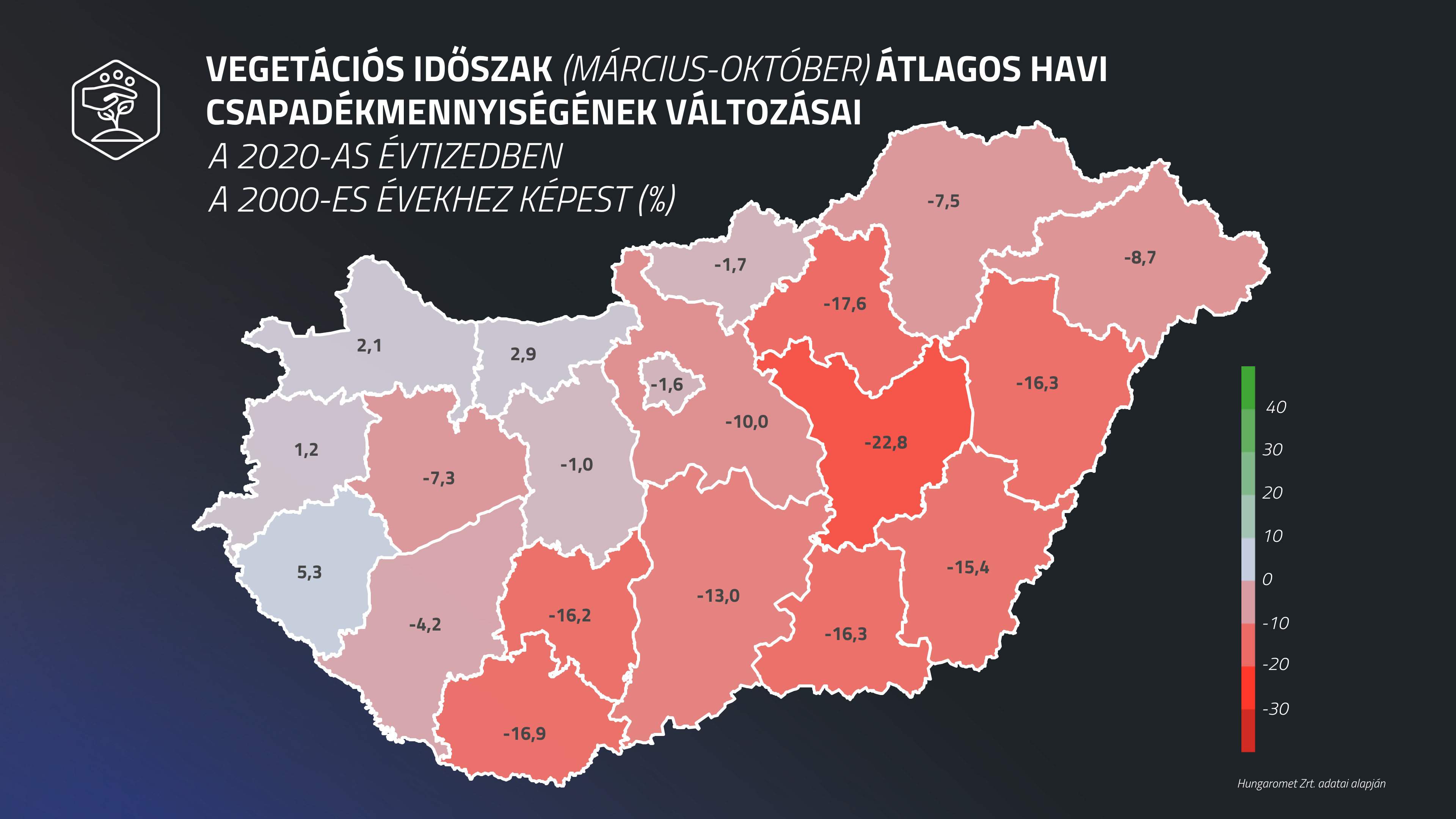 Amennyiben a változást a növények számára legfontosabb hónapokban vizsgáljuk (vegetációs időszak, amely az elemzésünkben a március és október közötti hónapokat jelenti), az évtizedes változás még drasztikusabb képet mutat. A 2000-es évekhez képest a 2020-as évtizedben a vegetációs időszak átlagos havi csapadékmennyisége a nyugati vármegyékben enyhe növekedést mutat, ezzel szemben Zala és Komárom-Esztergom vármegye vonalától kelet felé haladva fokozatosan nő a csapadékhiány mértéke. Az alföldi vármegyék közül a legnagyobb csapadékmennyiség-csökkenéssel Jász-Nagykun-Szolnok vármegyének kellett szembenéznie.