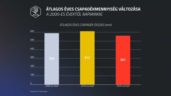 A vizsgált évtizedekben összességében az átlagos országos csapadékmennyiség keveset változott. A 2010-es években volt két kiemelten csapadékos év – 2010 és 2014 –, amelyek jelentősen megemelték az évtizedes átlagot, 610 mm fölé. A 2000-es és a 2020-as évtized országos viszonylatban egymáshoz hasonló képet mutat, csapadékos és száraz évek váltják egymást.