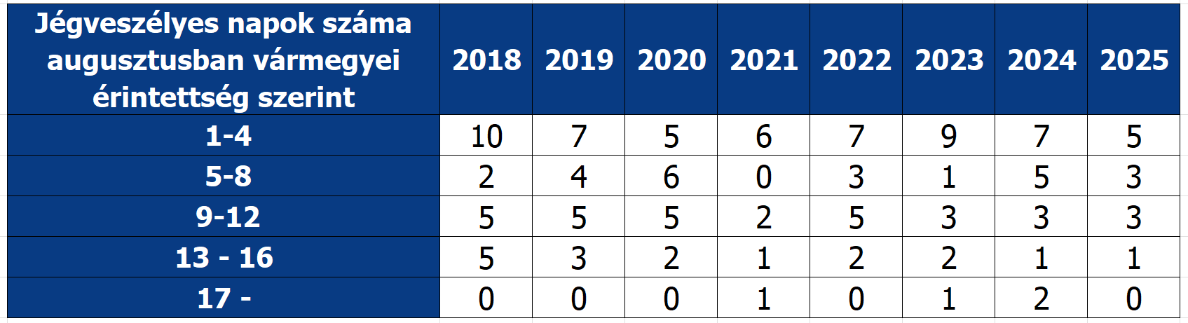 Mivel augusztusban csak kevés jégveszélyes zivatar alakult, ez jól látható a jégveszélyes napok számát illetően hiszen a hónapban csak 1 olyan nap volt, ami nagyobb területet, legalább 13 vármegyét érintett.