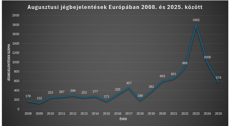 A hónap nem csak Magyarországon, hanem Európában is extrém időjárási eseményeket hozott. Európa több régióját ismét aszály sújtotta, amit a tartós hőhullámok és átlag alatti csapadékot eredményezett. Az ESWD adatbázis alapján az elmúlt 17 év időtávlatában 2025. augusztusban történt a 6. legtöbb jégbejelentés. Mindennek az az oka, hogy a tartós hőhullám, így az aszály következtében sokkal kevesebb jégveszélyes zivatar tudott kialakulni augusztusban.