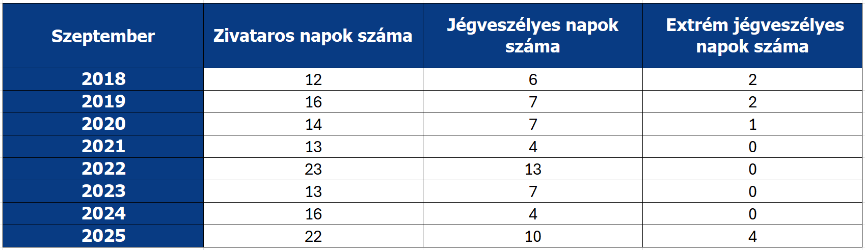 Idén szeptemberben 22 napon alakultak ki zivatarok, ebből 10 napon alakult ki olyan zivatarfelhő, amelyből előfordulhat jégeső és csak 4 olyan nap volt, amikor a jégveszélyes zivatarfelhők olyan hőmérsékleti határt értek el, amelyből nagy méretű jégszemek hullhatnak.