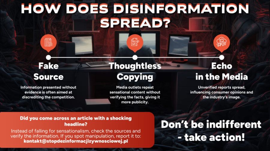 A lengyel Nemzeti Baromfi Tanács – Kereskedelmi Kamara (KRD-IG) az élelmiszerekkel kapcsolatos álhírek és félrevezető információk egyre növekvő áradatára reagálva új e-könyvet jelentetett meg „Élelmiszerekkel kapcsolatos dezinformáció: hogyan lehet felismerni és reagálni rá” címmel – ez az első gyakorlati, részletes útmutató arról, hogy hogyan terjednek a félrevezető narratívák a közösségi térben. Ez az új e-könyv világosan elmagyarázza, hogyan terjednek az álhírek, valós példákat hoz a média manipulációkra, eszközöket kínál az álhírek és „kattintásvadász” tartalmak felismerésére, valamint útmutatást ad a megbízható információk megtalálásához. Rámutat arra is, hogy akár ártalmatlannak tűnő jelenségek vagy egyéni megjegyzések is felhasználhatók egész iparágak ellen.