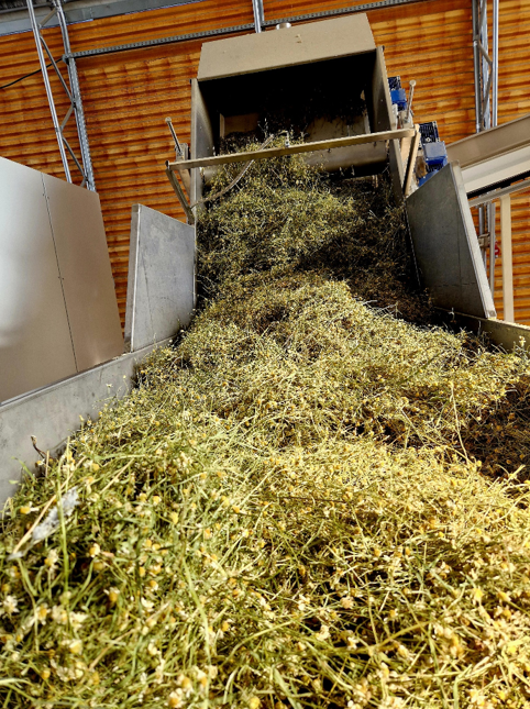 A kamilla gyűjtése nemcsak Magyarországon, de a szomszédos országokban, így Horvátországban is csökkenő tendenciát mutat, így egyre meghatározóbb a növény termesztése. Üzemi méretekben a betakarításához elengedhetetlen a kamilla kombájn, vagy speciális betakarítógép használata (1. kép). Az üzemlátogatás során megtekintett traktorra szerelhető kamillabetakarító nemcsak kamilla, de kis átalakítással más levelükért termesztett gyógynövénykultúrák (pl.: citromfű, menta, csalán) betakarítására is használható. A virágok eltávolítására szolgáló rotor egy ferde szállítószalagra helyezi a virágokat, amely a kamillát egy garatba juttatja. A vágóasztal magasságának módosításával a kamilla mellett más virágok, pl.: körömvirág betakarítására is alkalmas a berendezés.