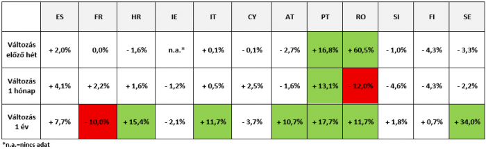 A 44. héten a nehéz bárány árak tekintetében Romániában igen jelentős, 60,5%-os, Portugáliában 16,8%-os, Spanyolországban 2,0%-os, Olaszországban 0,1%-os emelkedés, Finnországban -4,3%-os, Svédországban -3,3%-os, Ausztriában -2,7%-os, Horvátországban -1,6%-os, Szlovéniában -1,0%-os, Cipruson pedig -0,1%-os csökkenés volt tapasztalható az előző heti árakhoz képest.