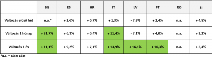 A könnyű bárány árak tekintetében a 44. héten Szlovéniában 4,5%-os, Spanyolországban 2,6%-os, Portugáliában 2,4%-os, Olaszországban 1,3%-os, Horvátországban 0,7%-os emelkedés, Lettországban pedig -7,9%-os csökkenés volt tapasztalható az előző heti árakhoz képest.