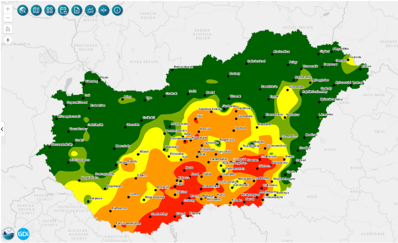 Az alábbi ábra az aszállyal való kitettséget reprezentálja. A piros szín a leginkább, a zöld a legkevésbé aszályos területeket jelzi, melynek alapján jól látható, hogy a déli országrész, azon belül is Baranya, Bács-Kiskun és Csongrád vármegye tekinthető a fokozottan veszélyeztetett területeknek.